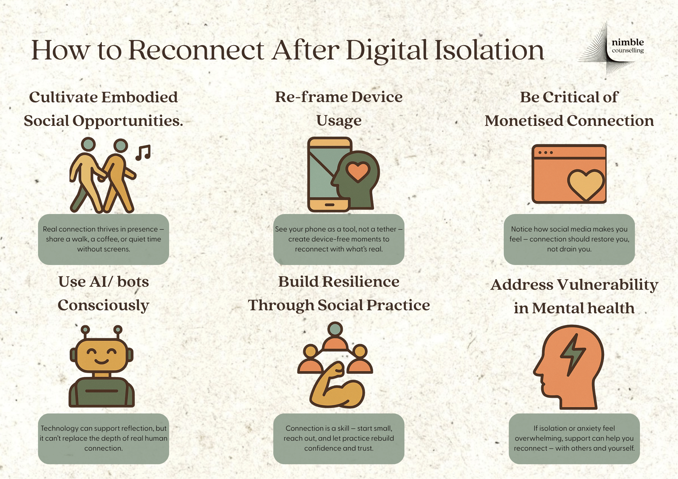 Be critical of monetised connection. Recognise that many platforms are designed for engagement, not necessarily for human flourishing. Ask: Do I feel connected after using this app, or do I feel drained, lonely, anxious? Research (e.g., by CAMH and others) shows that heavy social-media use correlates with poorer mental health outcomes. Use AI/ bots consciously. If you find solace in chatbots, acknowledge what they give and what they don’t. AI can supplement human interaction- but shouldn’t replace the unpredictable, messy richness of human connection. Be mindful if you begin choosing bots instead of people because people feel too hard.