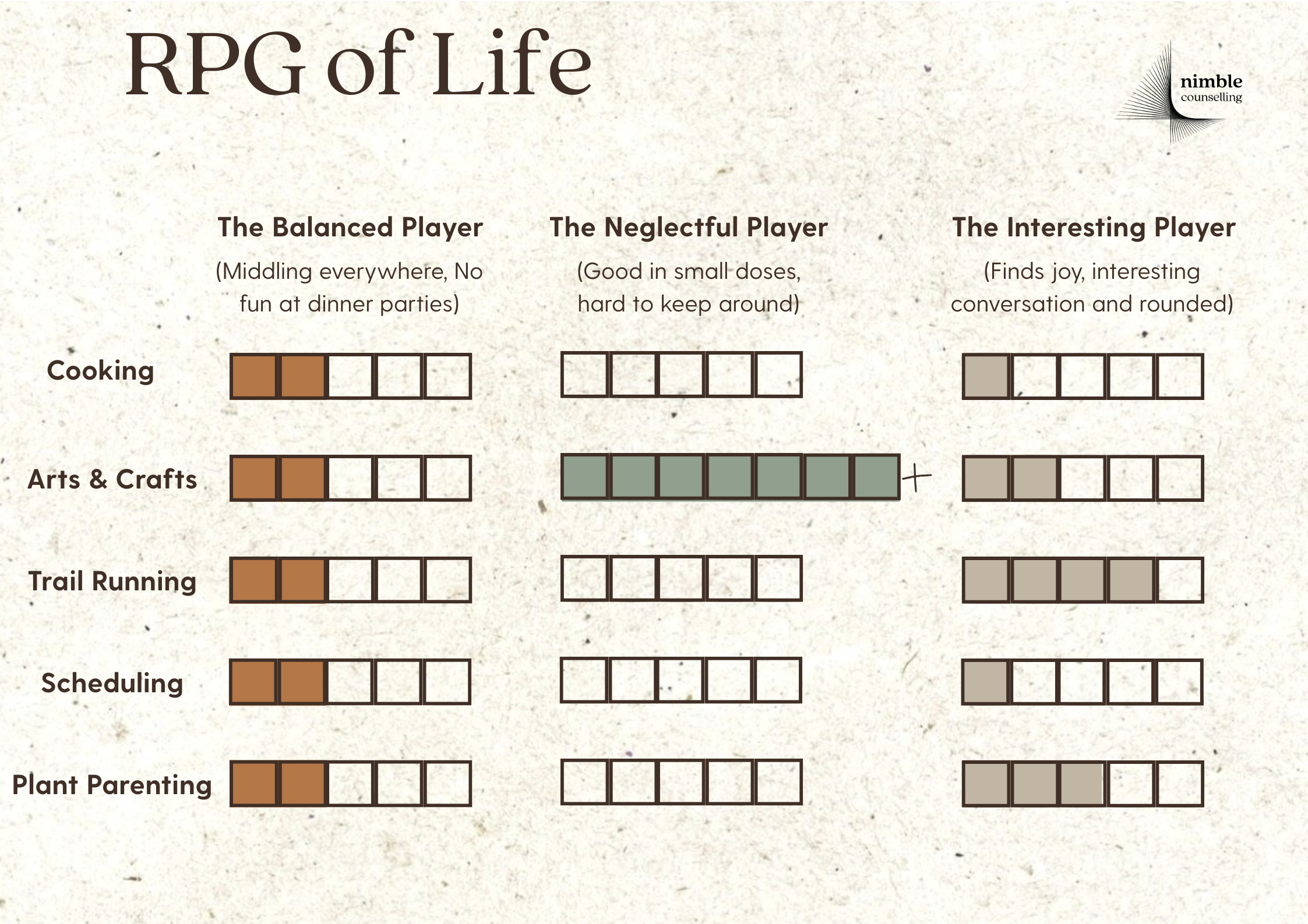 If reading this has left you wondering where your own “skill points” are going — or why you feel maxed out in all the wrong areas — you’re not alone. Sometimes it takes more than self-reflection to figure out what actually matters, where your energy’s leaking, and how to stop trying to level up everything at once. That’s where counselling can help. Nimble Counselling offers compassionate, evidence-based mental health support with registered clinical counsellors, available in-person in downtown Vancouver and online across British Columbia. Whether you’re feeling stuck, overwhelmed, burnt out, or just ready to reallocate your energy in a way that actually fits your life — therapy might be a great next step. Nimble’s here to help you sort through the noise and make room for what really matters.